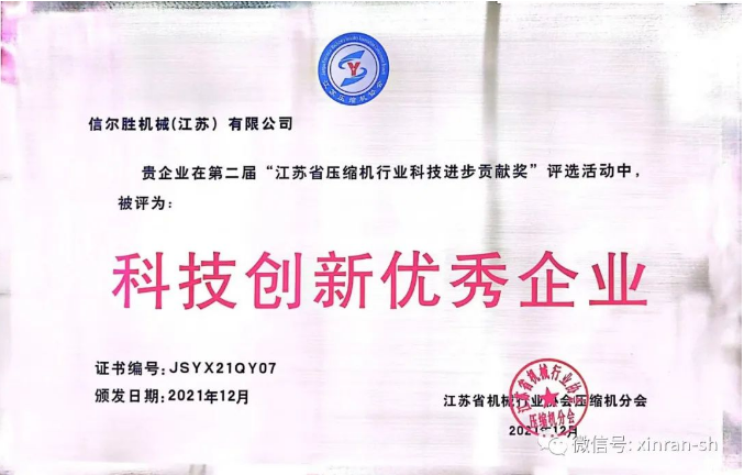 祝賀信然壓縮機徐州工廠— 信爾勝機械(江蘇)有限公司榮獲“科技創(chuàng)新優(yōu)秀企…
