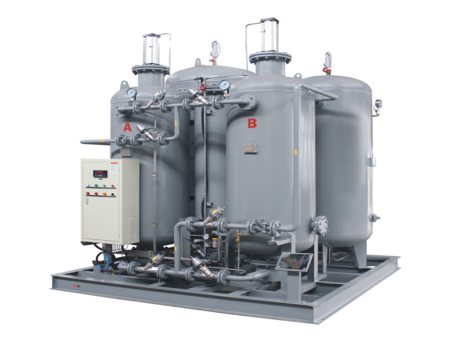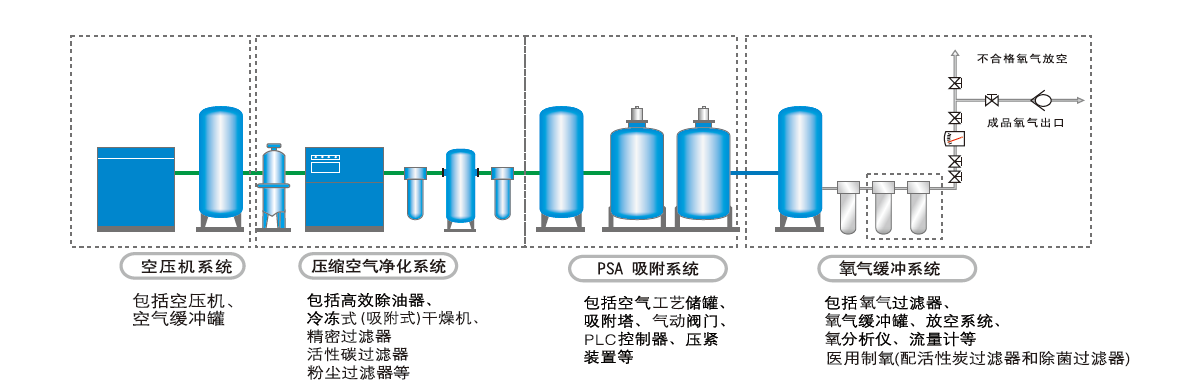 XRYQ制氧裝置是運(yùn)用PSA變壓吸附原理精心研制,以優(yōu)質(zhì)制氧分子篩為吸附劑,直接在常溫下從空氣中分離和制取氧氣。經(jīng)過(guò)干燥凈化處理的壓縮空氣,進(jìn)入裝有分子篩的吸附塔,空氣中的氮?dú)?、二氧化碳、水份等被大量吸附以分子篩固相中,而氧氣因吸附量小而在氣相中富集輸出。當(dāng)吸附劑吸附達(dá)到飽和時(shí),則降低壓力使沸石分子篩解吸再生,使得沸石分子篩得以重復(fù)使用。系統(tǒng)設(shè)置兩個(gè)吸附塔,一塔吸附產(chǎn)氧,一塔吸附再生,利用進(jìn)口PLC控制循環(huán)交替兩塔,以實(shí)現(xiàn)連續(xù)產(chǎn)出高品質(zhì)氧氣。