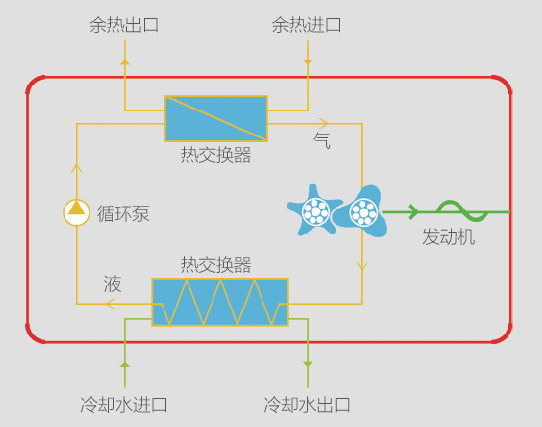 液態(tài)的有機(jī)工質(zhì)經(jīng)循環(huán)進(jìn)入熱交換機(jī),吸收余熱的熱量后生成一定壓力和溫度的有機(jī)工質(zhì)蒸汽,蒸汽推動螺桿膨脹機(jī)做功,輸出的動能帶動發(fā)電機(jī)實現(xiàn)發(fā)電,膨脹機(jī)排出的低壓有機(jī)工質(zhì)乏汽進(jìn)入冷凝器放熱,凝結(jié)成液態(tài)有機(jī)工質(zhì),再通過循環(huán)泵重新進(jìn)入熱交換器,如此往復(fù)循環(huán)實現(xiàn)了熱能與動能的轉(zhuǎn)換。