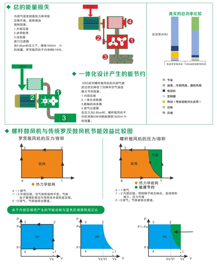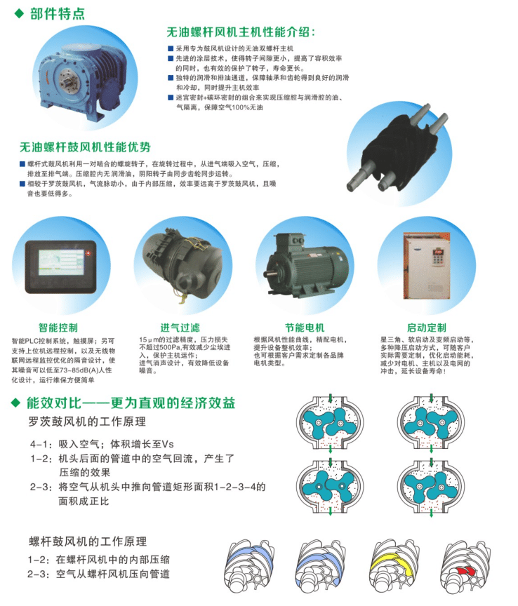 采用專為鼓風機設計的無油雙螺桿主機;涂層技術使得轉子間際更小。提高了容積效率的同時,也有效的保護了轉子,壽命更長。